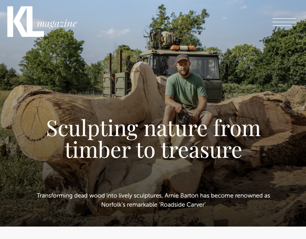 Arnie has produced an impressive array of commissioned and self-inspired pieces over the years. These include a redwood skiing man for a crazy golf course, a seven-foot-tall Warhammer figure made from four separate pieces of sweet chestnut and an exquisitely detailed replica of a buried Lynn Kiln, as well as the more common carvings of owls, foxes and bears.